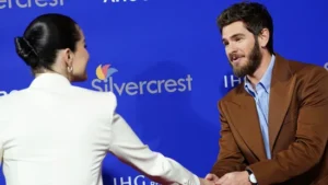 Andrew Garfield’s charming interaction with Selena Gomez at the Palm Springs Film Festival sparked a wave of fan speculation. A viral clip captured the actor’s lingering gaze and warm handshake with Gomez, who looked stunning in a white three-piece suit paired with a marquise diamond ring.