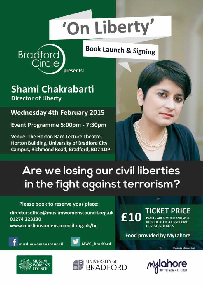 Shami eventThe Bradford Circle has been hosting a range of events since 2012. At their next event writer Shami Chakrabarti will be present discussing her first book ‘On Liberty’. Copies of the book will be available to purchase on the day, which she will be happy to sign. She will also be taking questions from the floor.