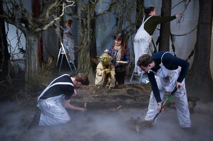 designers work on an atmospheric recreation of his Dagobah swamp scene